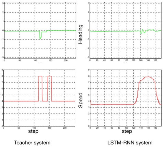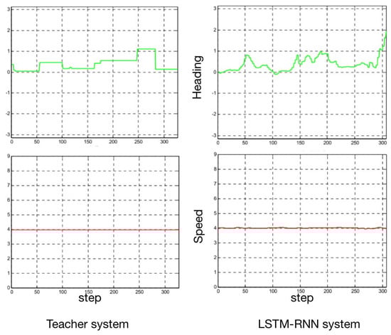 Figure 7 is a comparison of the output values of the teacher system and LSTM-RNN in scene 1. The teacher system updated the heading by triggering the planning mechanism of unknown obstacles, so its heading changed in a stepped manner, while LSTM-RNN was in a continuous planning state, and the heading and speed were updated all the time. The teacher system maintained uniform speed movement in scenes with static unknown obstacles, LSTM-RNN learned this characteristic, and the speed jitter was very small.