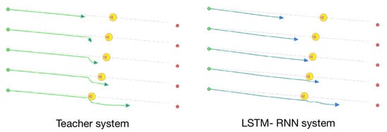 It is worth mentioning that the optimal path obtained by the LSTM-RNN method was symmetric, that is, whether it was from the starting point to the end point or from the end point to the starting point, the results of the two experiments were the same. The same error loss and motion trajectory were not available in the teacher system. In the optimal trajectory problem, symmetry is very important. Through symmetry, we can intuitively verify whether the experimental result is the optimal result, the optimal trajectory must be symmetrical.