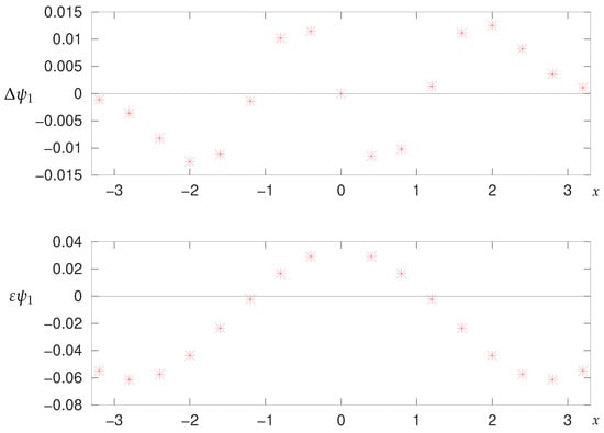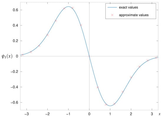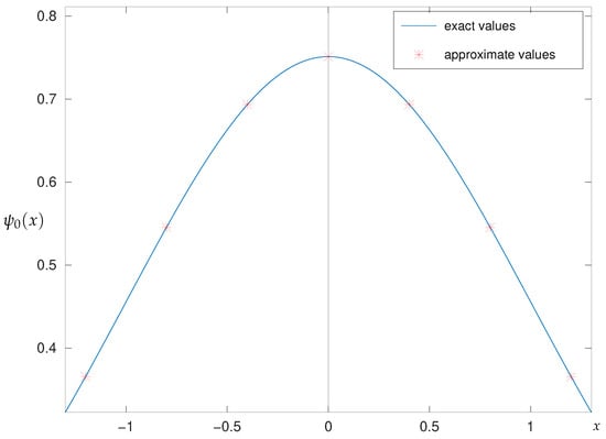 Figure 1, Figure 2, Figure 3 and Figure 4 for , show the exact and approximate values for the functions and together with the corresponding absolute and relative errors of calculations, respectively. The exact values for are obtained from the expressions