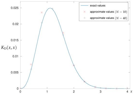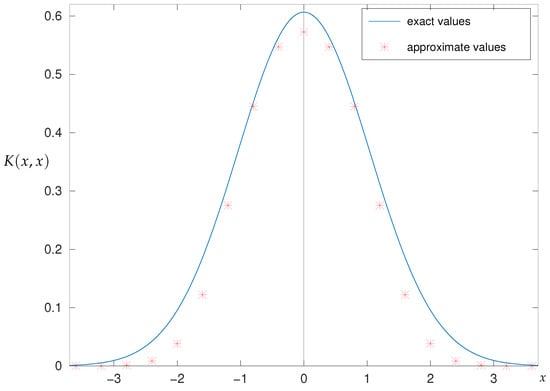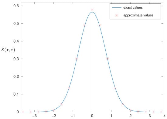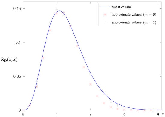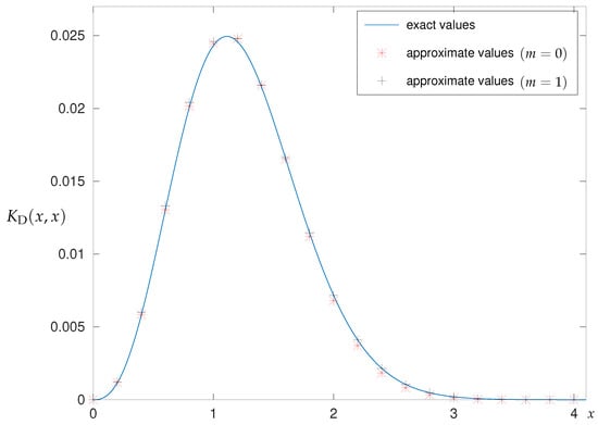 Figure 19, Figure 20, Figure 21, Figure 22, Figure 23 and Figure 24 show the exact and approximate values of the integral defined by Equation (2), at , , , for and , together with the corresponding absolute and relative errors of calculations, respectively.