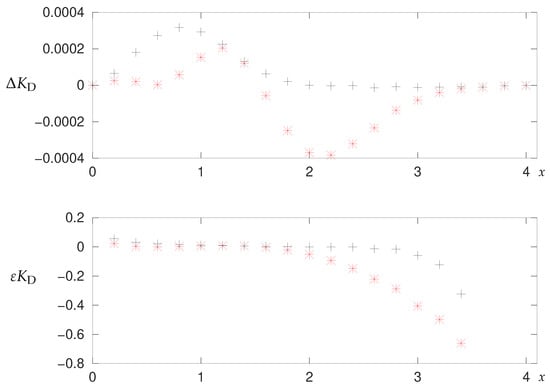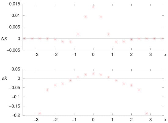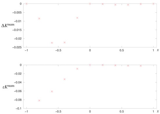 Figure 17 and Figure 18 show the exact and approximate values of the integral defined by Equation (2), at , , and for , together with the corresponding absolute and relative errors of calculations, respectively.