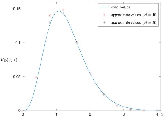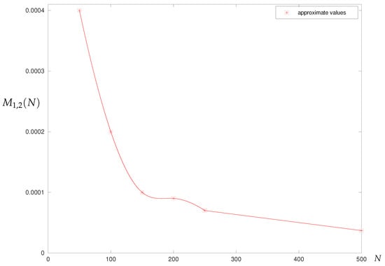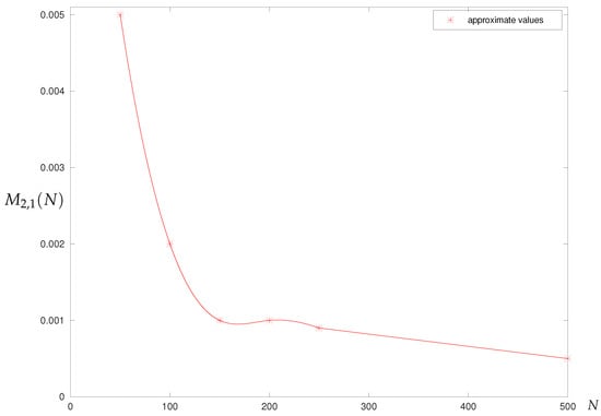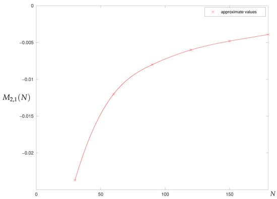 with indices and for , , the exact values are known and they are equal to zero. For comparison, Figure 29 shows the approximate values of the elements of the matrix valued integral with index for different values N.