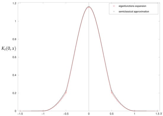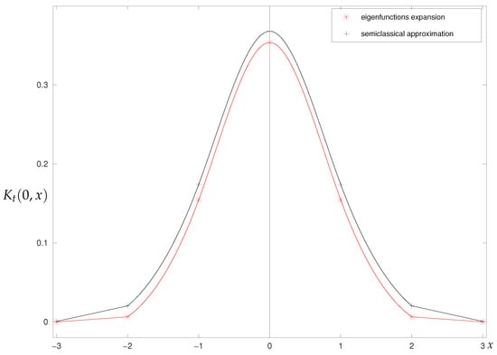 In this section, we consider a semiclassical approximation for calculating the indicated functional integrals [,,]. The semiclassical approximation uses the expansion of the action with respect to the classical trajectory [], which can be interpreted as an expansion in powers of the Planck constant. In this section, we describe the method of semiclassical approximation of functional integrals and perform a numerical analysis of the accuracy of the semiclassical approximation of functional integrals. For numerical analysis, we compare the results obtained with the help of semiclassical approximation and with the help of the method of calculating functional integrals based on the expansion in terms of eigenfunctions of the Hamiltonian generating the functional integral. When approximating the functional integrals based on the expansion in terms of the eigenfunctions of the Hamiltonian, one can estimate the accuracy of the obtained approximate values. The semiclassical approximation can be used for a fairly wide range of problems. For example, the semiclassical approximation is used in the calculation of functional integrals used in field theory, in particular, in the theory of gravitation. However, to estimate the accuracy of the semiclassical approximation, a comparison with the results obtained by other methods is necessary.