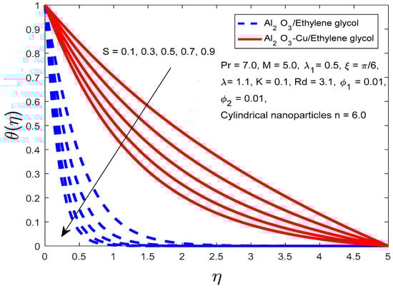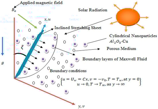 Consider viscous, incompressible, and two-dimensional hybrid Maxwell fluid flow and heat transfer over a stretching sheet angled at an angle embedded in a porous medium. The flow direction is in the -axis and the normal to the flow is in the -axis. The flow diagram representing the flow structure is shown in Figure 1. In Figure 1, the flow pattern is shown, in which the surface is kept inclined at an angle as an appropriate choice. Stretching of the plate induces flow.It has been considered a porous surface with suction effects to control the boundary layer’s thickness. The surface is embedded in a porous medium, and the fluid is saturated with and cylindrical shaped nanoparticles, as shown in Figure 1. The flow direction is in the -axis, and is -component of velocity. The -axis is taken in the normal direction of fluid flow, and suction of plat is in -direction shown in Figure 1. The magnetic field of strength is applied to the vertical direction to control flow speed and maximize the temperature by generating the current. As a renewable energy source for energy savings, solar radiation is included in the energy equation shown in Figure 1. By following [31,32], we have the following flow equations:
