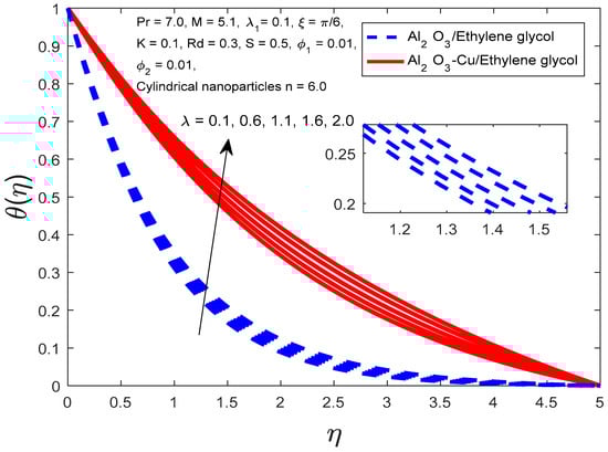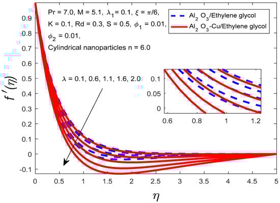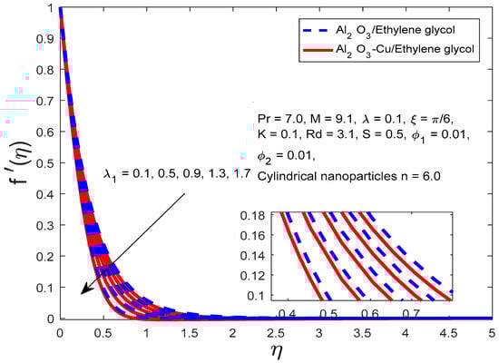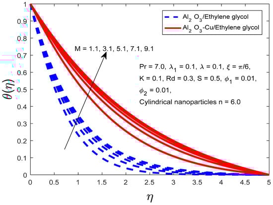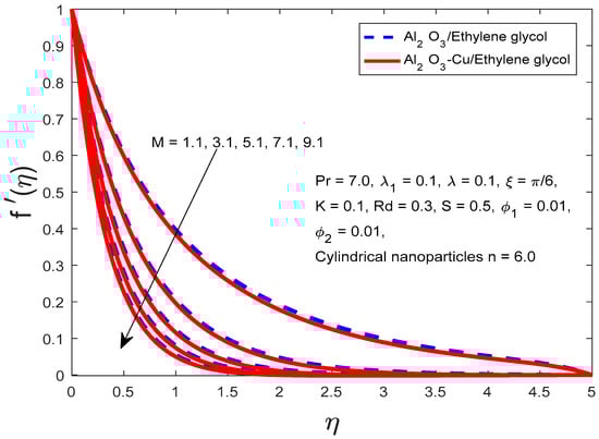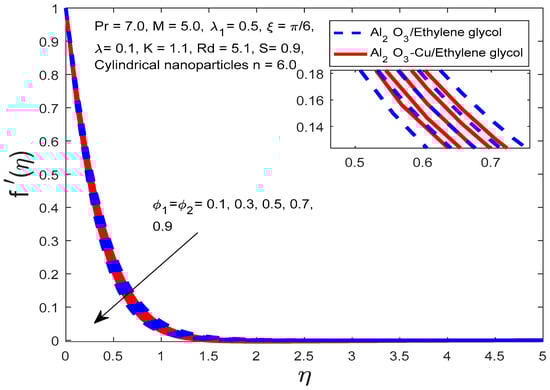 Figure 2, Figure 3, Figure 4, Figure 5, Figure 6, Figure 7, Figure 8, Figure 9, Figure 10, Figure 11, Figure 12 and Figure 13 are illustrate the graphical aspects of physical quantities such as velocity field , and temperature field under the pertinent parameters. Figure 2 reveals the non-dimensional velocity behavior versus increasing inputs of . Figure 2 illustrates that growing values of results in decreasing magnitude of for both cases mono fluid glycol(NF) and glycol hybrid nanofluid(HNF).