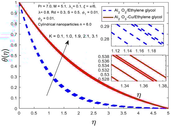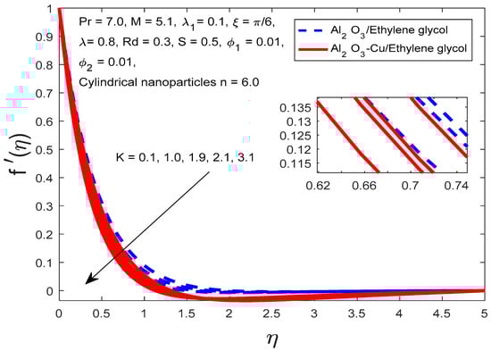 - According to the definition of the porosity parameter, an increase in the porosity parameter results from an increase in kinematic viscosity and a decrease in porous spaces, which impede fluid flow and reduce speed. Additionally, when we compare the cases of nanofluid and hybrid nanofluid, the volume proportion of nanoparticles in nanofluid is lower than that in hybrid nanofluid, which results in stronger velocity curves for nanofluid;