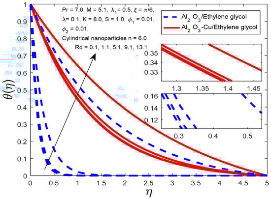 - As the radiation parameter is enhanced, the temperature of the fluid flow domain rises. The purpose of the radiation parameter in the energy equation is to raise the temperature of the fluid, hence serving its purpose;
