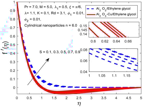 Figure 8 and Figure 9 show the influence of magnetic field number on and , respectively. When is augmented, becomesdelineated and gets raised. This is entirely based on the physics of the magnetic field parameter. The inclusion of generates the Lorentz force retards the motion of the fluid, and the resistive force creates an enhancement in the temperature. The resistive force intensifies the temperature of the fluid and hinders its flow speed. The effects of the suction parameter on and have been shown in Figure 10 and Figure 11, respectively. As the suction parameter is intensified, there is an augmentation in the velocity and are duction in the temperature. By the definition of suction parameter, a rise in suction parameter is due to a reduction in the kinematic viscosity, and hence the speed of the flow is minimized. Figure 12 and Figure 13 is entirely focused on impact of nanoparticles volume fraction of type one and types second on and . As are augmented decreases and increases. More nanoparticles in a fluid can make it heat up faster, as they are typically better at conducting heat than the fluid itself. This means that heat is transferred more quickly, raising the fluid’s temperature. However, more nanoparticles can also slow the fluid’s flow. This is because they increase the fluid’s thickness or viscosity, making it harder for the fluid to move. For the validation of the current results, the comparison of the present solutions for the Nusselt number with the already published results is given in Table 2. From the comparison, it has been concluded that there is excellent agreement between the present and published solutions, which serves the purpose of ensuring the accuracy of the proposed model. Table 3 and Table 4 are showing the numerical results of skin friction and Nussle number for the Prandtl number and the buoyancy parameter , respectively.Table 3 represents the Prandtl number effects on skin friction and the Nusselt number for nanofluid \Ethylene glycol and hybrid nanofluid -\Ethylene glycol. It has been noted that as is enhanced decreases and is increased remarkably. Table 4 is illustrating the effect of buoyancy parameter on and Nussle number for nanofluid \Ethylene glycol and hybrid nanofluid -\Ethylene glycol. The varying values of show that as is raised rises and reduces gradually. All the graphs satisfy the given boundary conditions asymptotically.