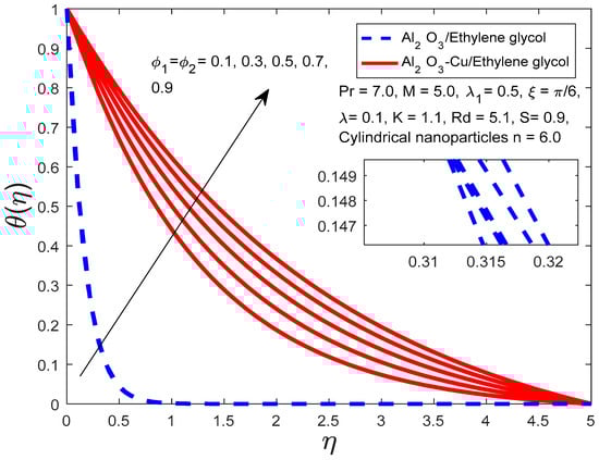 where and are the volume fractions of solid nanoparticles, Alumina ( and Copper (), respectively. Here, and are used to differentiate the thermophysical characteristics of base fluid, nanoparticles of the first type , and nanoparticles of the second type , respectively.