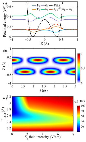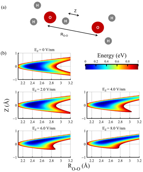 - Cassone, G. Nuclear quantum effects largely influence molecular dissociation and proton transfer in liquid water under an electric field. J. Phys. Chem. Lett. 2020, 11, 8983–8988. [Google Scholar] [CrossRef]