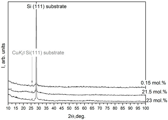 To assess the possibility of formation of silicon nanocrystals in a-SiOx:H + ncl-Si films, XRD patterns of the films obtained at an oxygen content of 0.15, 21.5 and 23 mol.% were obtained in the chamber of the process reactor (Figure 1).