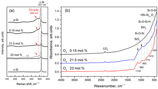 Therefore, to establish the presence of an amorphous silicon phase in a-SiOx:H + ncl-Si films, Raman spectra were obtained (Figure 2a). Figure 2a clearly shows that in the sample with a minimum oxygen content (0.15 mol%), transverse optical (TO) modes at ∆v~480 cm−1 and longitudinal optical (LO) modes at ∆v~420 cm−1 are well observed, as well as transverse acoustic (TA) modes at ∆v~155 cm−1 and longitudinal acoustic (LA) modes at ∆v~310 cm−1, which is characteristic of the amorphous phase in silicon a-Si [35,36,37,38]. With an increase in the concentration of oxygen in the composition of the gas mixture from 0.15 to 23 mol.% in the Raman spectra of a-SiOx:H + ncl-Si films, the relative intensity of the optical mode of the TO (∆v~480 cm−1) decreases from ~0.2 to 0.01 rel. units, respectively. In addition, in the Raman spectra of all the films, a strong TO mode is observed at ∆v~521 cm−1, which in its position and half-width (5.5 cm−1) corresponds to the spectrum of single-crystal silicon (c-Si) [38]. Since, according to XRD data, silicon phases with translational symmetries were not detected in a-SiOx:H + ncl-Si films, the mode at ∆v~521 cm−1 occurs due to a monocrystalline silicon substrate. Thus, according to Raman spectroscopy data, the presence of an amorphous silicon phase was determined in a-SiOx:H + ncl-Si films.