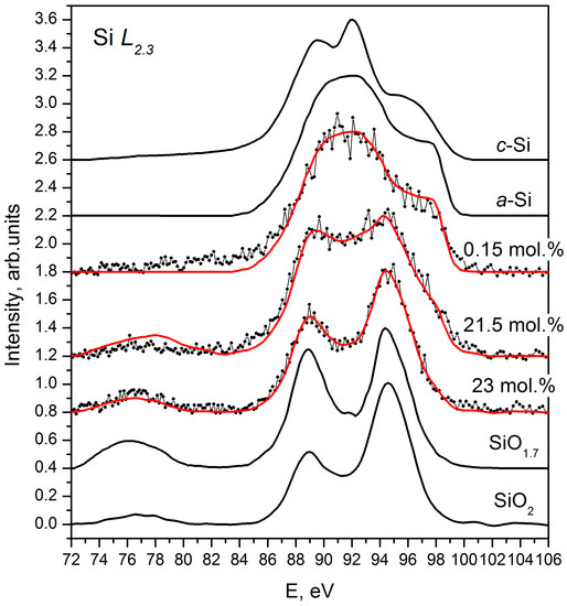 For more accurate determination of the phase composition from the obtained Si L2.3 spectra of a-SiOx:H + ncl-Si films, computer simulation of the valence band spectrum based on reference spectra was carried out according to the method described in [33]. The simulated spectra are shown in Figure 3 (red curves); the results of analysis of the phase composition of a-SiOx:H + ncl-Si films obtained at different concentrations of oxygen in the gas mixture, according to USXES data, are presented in Table 1.