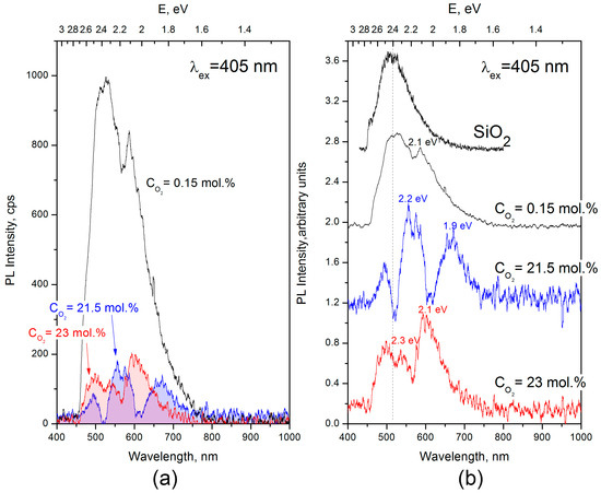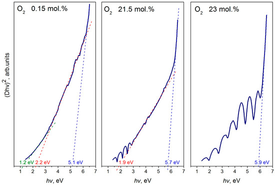 Figure 4 shows the dependences of the optical absorption coefficient of a-SiOx:H + ncl-Si films obtained in a gas mixture with different oxygen content (0.15, 21.5, 23 mol.%) during plasma chemical deposition. For the a-SiOx:H + ncl-Si (0.15 mol.%) film, three linear sections are observed in the UV spectrum, and their extrapolation offers the following values of the optical band gap: 1.2, 2.2 and 5.1 eV (Figure 4). If the absorption edge at 1.2 eV corresponds to amorphous silicon, then the edge at 2.2 eV can be attributed to silicon nanoclusters of ~2 nm in size [3,27]. The high-energy absorption edge at 5.1 eV is due to the absorption of SiOx, suboxides present on the silicon surface. According to [41], the optical band gap of ~5 eV corresponds to the SiO1.8 suboxide. for the a-SiOx:H + ncl-Si (21.5 mol.%) film along with the interference pattern, two linear regions are observed in the optical absorption spectrum, and their extrapolation offers the optical band gap of 1.9 eV and 5.7 eV, which is due to the absorption of silicon nanoclusters with a size of ~3 nm [27,41] and a suboxide matrix [41], respectively. In the case of the a-SiOx:H + ncl-Si (23 mol.%) film, a strong interference pattern and one linear section are observed in the UV spectrum, and their extrapolation makes it possible to determine the optical band gap for SiO1.9 suboxide (5.9 eV) [41]. Assumption of the relationship of the absorption edges at hv~2.2 eV and hv~1.9 eV with silicon nanoclusters of ~2–3 nm in size is consistent with the presence of photoluminescence (PL) bands in the energy range of ~2.3–1.9 eV (Figure 5). At the same time, in the PL spectrum of the a-SiOx:H + ncl-Si (0.15 mol.%) film, the main maximum in accordance with its position and half-width is close to the PL spectrum of silicon oxide SiO2 (defect related luminescence in SiO2 network). This is clearly seen in Figure 5b (black curve), where the normalized PL spectra are presented. In turn, the presence of the additional maximum of PL at 2.1 eV correlates with UV spectroscopy data, where a direct transition was detected for this sample at hv~2.2 eV, and this may be due to the luminescence of silicon nanoclusters with a size of ~2 nm [3,27]. However, the intensity of this maximum is quite low, i.e., the main contribution to the PL spectrum of this sample is offered by silicon oxide defects. Increasing oxygen content in the process reactor chamber to 21.5 mol.% leads to the transformation of the PL spectrum with the appearance of pronounced PL bands at 2.2 and 1.9 eV (Figure 5b, blue curve). There is also a decrease in photoluminescence intensity, despite the high content of silicon nanoclusters in the film (40%), which is clearly seen in Figure 5a (blue curve). Such decrease in PL may be due to a high content of the SiO1.3 phase in the dielectric matrix (detected according to USXES data) with a large number of defects that are the centers of non-radiative recombination. The presence of PL bands in the a-SiOx:H + ncl-Si (21.5 mol.%) film at 2.2 and 1.9 eV is consistent with UV spectroscopy data, and indicates the formation of two arrays of nanoclusters in the film with average sizes of ~2 and ~3 nm [3,27,41]. Further increase in the oxygen content up to 23 mol.% in the composition of the gas mixture during plasma chemical deposition leads to a short-wave shift of the PL peaks to ~2.3 and ~2.1 eV (Figure 5b), which may be due to a decrease in the size of silicon nanoclusters to ~1.5–2 nm [3,27,41]. In addition, despite the low content of silicon nanoclusters (15%) in this sample, there is no noticeable decrease in the intensity of the PL spectrum compared to the a-SiOx:H + ncl-Si (21.5 mol.%) sample (Figure 5a). This may be due to the presence of SiO2 and SiO1.7 phases (with a higher symmetry of silicon–oxygen tetrahedra and, as a consequence, a lower defect content compared to the SiO1.3 phase) being a part of the dielectric matrix. Thus, nonlinear qualitative and quantitative changes in the phase composition of a-SiOx:H + ncl-Si films under the influence of oxygen lead to a short-wave shift of the PL peaks.