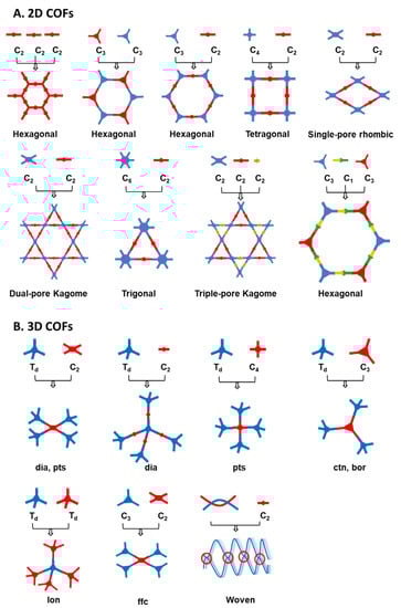 Topology diagram representing a general basis for design and construction of (A) 2D COFs and (B) 3D COFs [].
