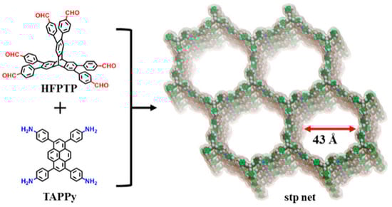The addition of triptycene fragments makes it possible to improve the stability and strength parameters of polymeric materials. However, despite the reported use of triptycene for the synthesis of polymeric materials, there are not many reports on the use of triptycene for analogous purposes in the synthesis of COFs. The reason for this phenomenon is most likely due to the fact that the class of porous COF-type materials was established relatively recently (2005) [] and is only beginning to develop. Moreover, of the COF structures obtained so far, 2D structures predominate, while 3D COF structures are more difficult to obtain. Based on publications on the addition of triptycene fragments to polymeric materials, it can be expected that the introduction of these fragments into crystalline structures increases the crystallinity of COF materials, enriches the specific surface area with additional internal volume (IMFV), and the incorporation of a rigid triptycene backbone guarantees the stability and resistance of the system to thermal and chemical effects. Between 2020 and 2021, five articles were published in which the authors describe the synthesis of 3D COFs based on triptycene. All of the published syntheses are based on the same starting reagent: (six-connected) [2,3,6,7,14,15-hexakis(4-formylphenyl)Triptycene] (HFPTP), whose spatial structure resembles a triangular prism. In 2020, H. Liu et al. published the reaction between HFPTP and synergistic 4-connected 2D D2h monomer 1,3,6,8-tetrakis(4-aminophenyl)pyrene (TAPPy) which resulted in the first 3D COF material based on triptycene with stp topology, JUC-564 (Figure 3) []. It is the only example of such a material to date.