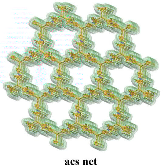 H. Liu et al. obtained two new 3D COF materials by reacting HFPTP sequentially with 6- and 1,3,5-tris(4-aminophenyl)triazine (TAPT) JUC-568 with a ceq topology (Figure 3) connected 2,3,6,7,14,15-hexa(3′,5′-diisopropyl-4′-amino) Triptycene (HDIATP) JUC-569 with an acs topology (Figure 4) []. JUC-569 exhibited good thermal stability (TGA: ~400 °C). BET analysis and measurement of N2 adsorption showed that the specific surface area was equal to 1254 m2/g and was mainly rich in micropores with a diameter of about 13 Å (1.27 nm). JUC-568 was obtained in an analogous manner to the material published in the same year by Z. Liu et al. [3D-ceq-COF] [], which showed similar structural parameters and a ceq topology (Figure 5).