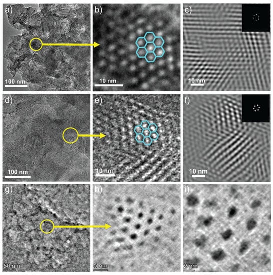 (a) TEM image of Trip-COF 1; (b) TEM image of Trip-COF 1 giving an enlarged view of the selected area in panel (a); (c) Fourier-filtered image of selected areas of Trip-COF 1; inset: fast Fourier transform (FFT) from the selected areas; for Trip-COF 2 see (d–f), respectively; (g) iDPC image of Trip-COF 1; (h,i) enlarged views of a selected area in panel (g) [].