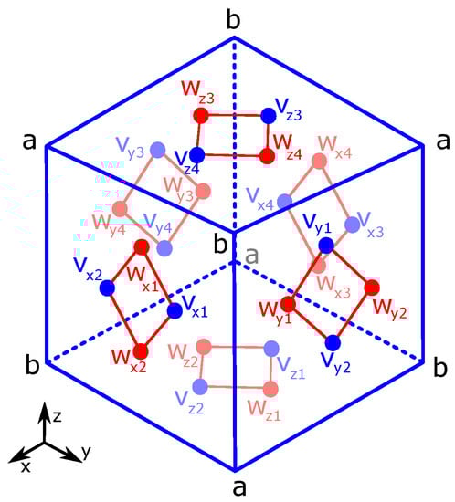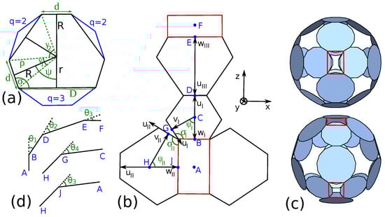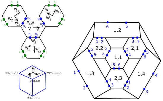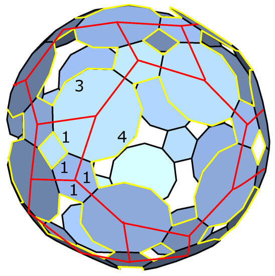 In what follows, we use and to denote the number of faces of type 1 and 2 of the p-cage and and to denote the number of edges of the faces of each type. Each hole will be made of edges where we include a hole index h as a p-cage can have different types of holes.