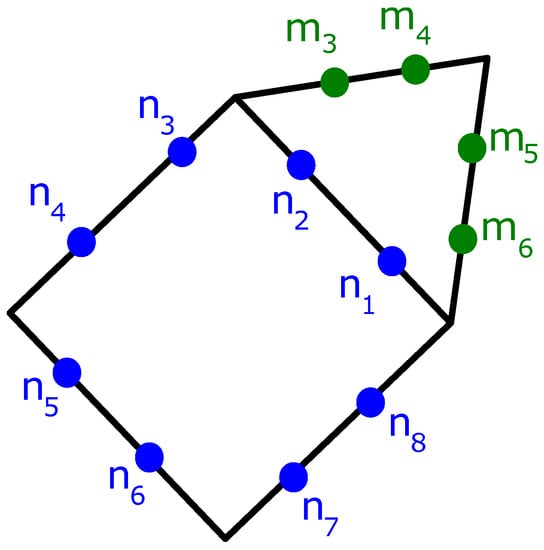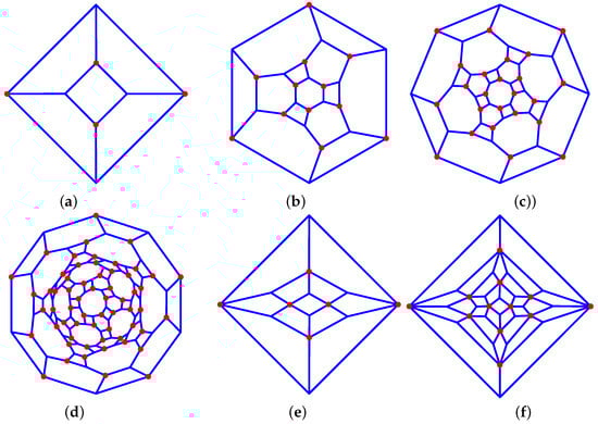 We denote, respectively, the number of vertices, faces, and edges of the planar graph by V, F, and E; and, by Euler’s formula, they satisfy the constraint . We have vertices of 2 different numbers of edges, and , and we denote the number of vertices of type j by .