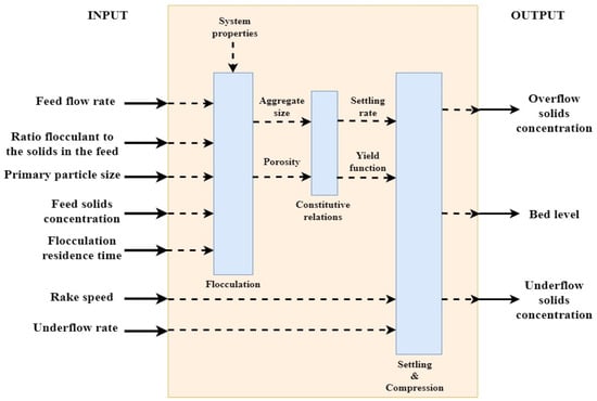 The diagram showing the relationship between various input and output parameters of the thickener/washer is presented in Figure 1. The input process parameters are the feed flow rate, ratio of the flocculant to the solids in the feed, primary particle size, feed solid concentration, flocculation residence time, rake speed, and underflow rate. The output parameters are the overflow solids concentration, bed level, and underflow solids concentration. It is important to note that the input parameters do not affect the final result of the process directly because the process of liquid–solid separation consists of several sub-processes, namely a flocculation sub-model, free sedimentation sub-model, and compaction sub-model.