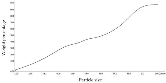 The studied pulp sample particle size distribution was in the range of 1.2–300 microns. Based on particle size distribution analysis, it was found that the predominant composition of the solid component consists of smaller classes, with the class below 100 μm constituting approximately 80%.