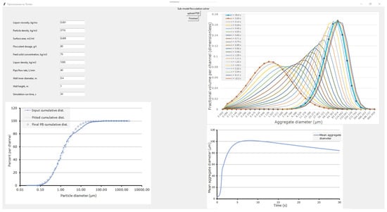 A user interface was developed in which the input parameters are the initial pulp size distribution, viscosity and density of the pulp in the thickener, particle surface area, flocculant concentration and flow rate, solids concentration, inner diameter and height of the feed well, and modeling time. The result of the flocculation model, namely the mean aggregate diameter, is used as initial value of the subsequent sub-processes of solid–liquid phase separation.