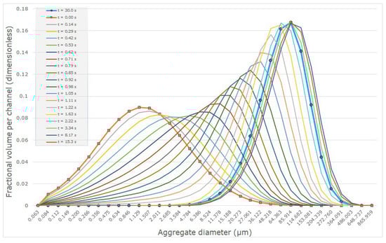 The model calculates the growth and decay of particles with a certain step and constructs a lognormal particle size distribution (Figure 4). In this study, the slurry predominantly contained fines, which significantly affected the particle distribution of flocculated particles. According to the modeling results, the particulate matter after flocculation is mainly in the following classes 27–153 μm (85.4%). The reason why the distribution becomes narrower in relative terms is that the flocculation process tends to change the aggregates into having an overall stable size. The smaller aggregates combine into larger aggregates, and the larger aggregates are less stable and more likely to be broken up. Flocculus disintegration was also accounted for in the model; the resulting curve is blue with a blue circle mark.