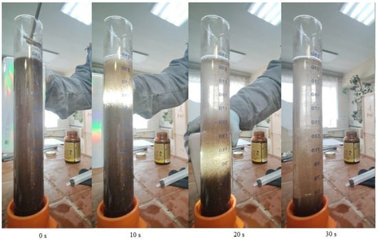 To meet the condition of complete homogenization of the pulp with the preservation of the initial properties of sedimentation, the cylinder was stirred non-intensively ten times by entering the plunger at the height of the beaker; this method of stirring is used in domestic practice in the preparation of the sample for sedimentation [38].