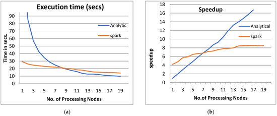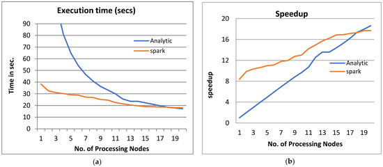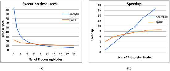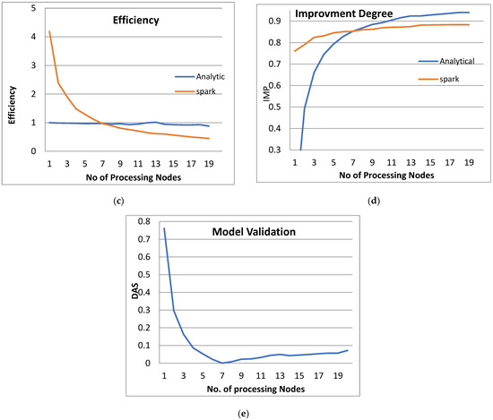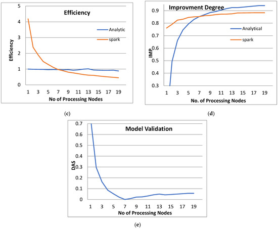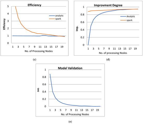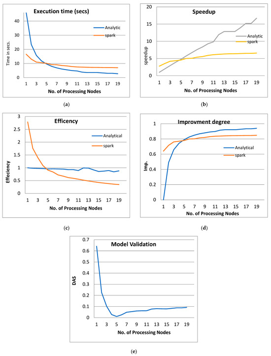 Figure 3 shows the performance analysis results of the analytical method and distributed processing (Spark) method for the PPQNTRUEncrypt for p = 3, q = 256, and N = 503. Figure 3a shows the results of the execution time analysis for the two methods. Figure 3b shows the speedup of the two methods against the number of processing nodes. Figure 3c shows the efficiency of the model analysis based on the two methods. Figure 3d shows the degree of improvement in using distributed processing analytically and Spark against the number of processes. Figure 3e shows the error decreasing against the number of analytical processing using distributed processing and Spark.
