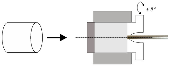 The SLM samples were post-processed via a KoBo-extrusion method, depicted in Figure 1, of which the principal description can be found in Ref. [22]. The extrusion process was conducted on a custom-made horizontal hydraulic press. The SLM samples were reversibly twisted with a constant angle of ±8° just before entering the die, where the cross section was reduced from 60 mm to 4 mm. The following process parameters were applied: