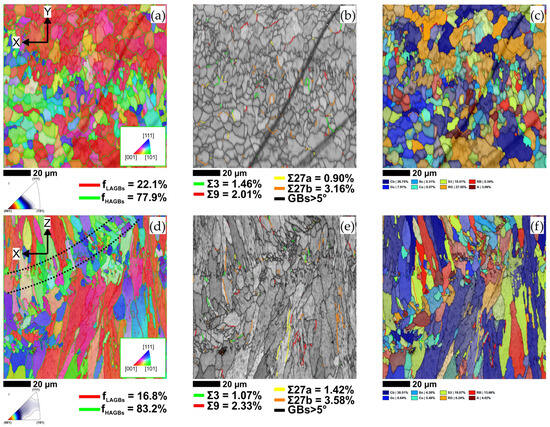 Figure 2d shows the IPF-Z map taken in the X–Z plane. EBSD investigation revealed typical columnar grain growth and confirmed the development of a strong <001>//BD texture corresponding to the <001>{001} preferred growth direction [23]. Because of the preferential growth of elongated grains towards the centre of the melt pool and the existence of small equiaxed grains, some of the melt pool boundary was also revealed, as indicated by the black dashed lines. According to statistical data, LAGBs accounted for 16.8% of the total boundary fraction, while HAGBs accounted for the remaining 83.2%. Figure 2e shows the grain boundary character-distribution map superimposed on the band contrast map. In the X–Z plane, the Σ3, Σ9, and Σ27 CSL boundaries occupied volume fractions of ~1.0%, ~2.3%, and ~5.0%, respectively, which were similar to the X–Y plane. The CSL boundaries were mainly distributed in grains that grew preferentially along the build direction, indicating that the crystal growth orientation could affect the twin formation ability [24]. According to the literature [25,26], the development of CSL boundaries in LPBF samples could stem from grain boundary migration and potential dynamic recrystallisation during sample fabrication, alongside alternative mechanisms involving icosahedral short-range order (ISRO) mediated nucleation.
