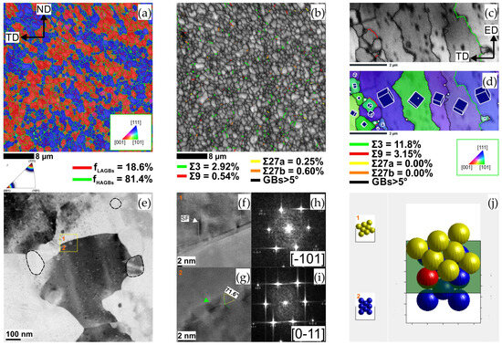 Figure 3b shows the CSL boundary map overlaid on the EBSD band contrast map. It reveals that the Σ3-CSL boundaries accounted for approximately 3% by volume, while the Σ9, Σ27a, and Σ27b boundaries together accounted for no more than 1.4%.