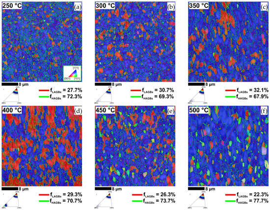 IPF-Z maps of the KoBo-processed samples (a) annealed at 250 °C for 1 h, (b) annealed at 300 °C for 1 h, (c) annealed at 350 °C for 1 h, (d) annealed at 400 °C for 1 h, (e) annealed at 450 °C for 1 h, or (f) annealed at 500 °C for 1 h.
