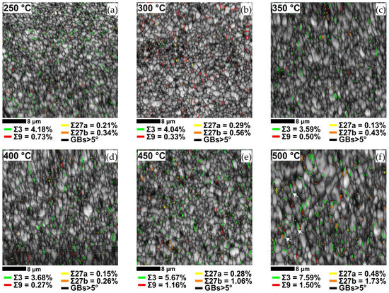 When the annealing temperature was further increased to 500 °C, more thermal activation energy was provided for recrystallisation, resulting in a higher percentage of special low-Σ-CSL GBs. Under these conditions, Σ3 and Σ9 boundaries accounted for 7.59% and 1.50%, respectively, while Σ27a and Σ27b boundaries contributed 0.48% and 1.73%, respectively. A noteworthy observation in this analysis was the distinctive well-defined and parallel-sided appearance of certain CSL-Σ3 boundaries, which is commonly associated with coherent twin boundaries formed during recrystallisation [33]. These boundaries are highlighted by white arrows in Figure 5f.