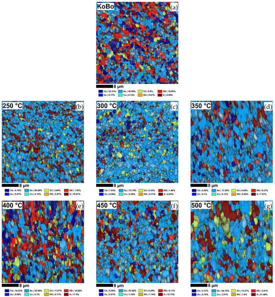 Texture components map with superimposed special grain boundaries for KoBo-processed and annealed samples. The colour coding is shown below the maps. (a) Kobo-processed, (b) annealed at 250 °C for 1 h, (c) annealed at 300 °C for 1 h, (d) annealed at 350 °C for 1 h, (e) annealed at 400 °C for 1 h, (f) annealed at 450 °C for 1 h, or (g) annealed at 500 °C for 1 h.