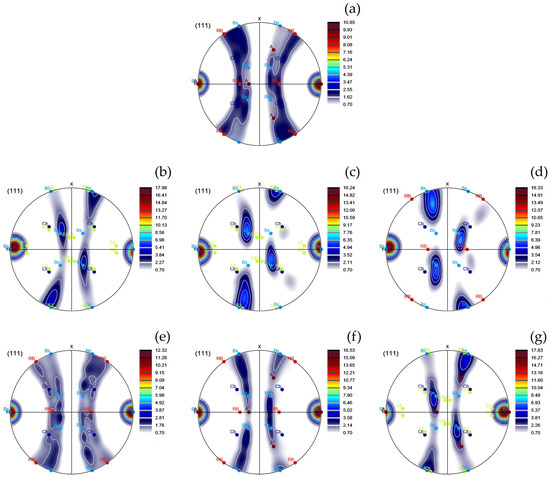 The (111) pole figures of the KoBo-processed and annealed samples. (a) Kobo-processed, (b) annealed at 250 °C for 1 h, (c) annealed at 300 °C for 1 h, (d) annealed at 350 °C for 1 h, (e) annealed at 400 °C for 1 h, (f) annealed at 450 °C for 1 h, or (g) annealed at 500 °C for 1 h.