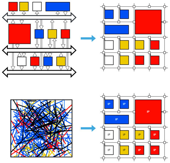 NoCs came to replace shared buses when integrated circuit design technology reached a level where it became possible to place tens and hundreds of processor nodes on a single chip. Then, the buses, as a communication infrastructure, became too slow and insufficient to transfer huge data flows between individual nodes, primarily due to the fact that when transmitting over a classical bus [8,9], they can only serve one transmission at a time. This shortcoming is partially mitigated by bus segmentation and the use of separate additional paths (DMA, Streaming interface, etc.) [10,11], serving intensive traffic flows. But, this is still not enough for multiprocessor systems with tens and hundreds of nodes. In the early 2000s, the concept of NoCs was proposed. Its main idea is to organize transmission on a chip by analogy with classical communication networks and divide the communication subsystem into separate short segments through which data are transmitted simultaneously and in parallel (Figure 1). In accordance with the new approach, transmission control is carried out using routers, and communication routes pass between NoC macroblocks [12,13]. This made it possible, at the initial stages of NoC design, to move away from the irregular placement structure of NoC macroblocks and take into account their spatial arrangement on the silicon die (upper part of Figure 1), as well as simplify the solution to the problem of confusion of connections, making them more regular and shorter (bottom part Figure 1).