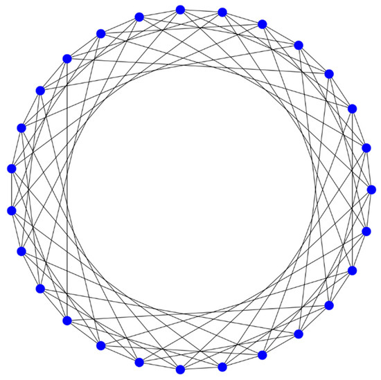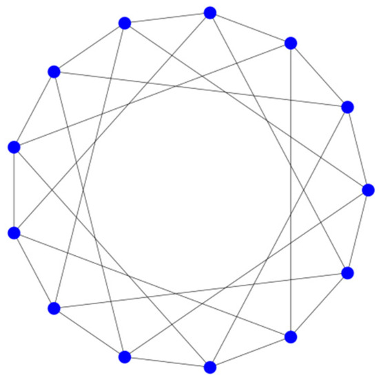 Assume that it is necessary to synthesize a NoC with a circulant topology of the type with an arbitrary number of generators, which is a special case of ring graphs (Figure 3). In a ring topology, all nodes are connected in series. The null node is adjacent to the last node. Also, every node has regular connections with a shift of several nodes clockwise and counterclockwise. Hereinafter, we use the standard notations given in reference [35].