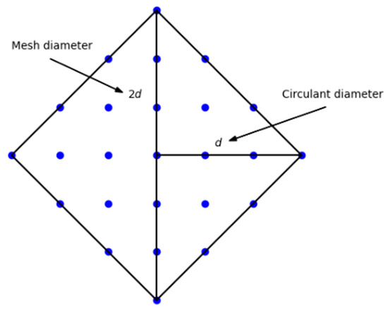 Thus, the 2D mesh topology is equivalent in node density to the 2D circulant, and the circulant with three generators (three-dimensional) corresponds to the 3D mesh topology [38,39]. In this case, the diameter of the circulant is less than two times. This is due to the symmetry that the circulant has. As mentioned earlier, the circulant is invariant under a transformation that takes an arbitrary vertex to any other. Therefore, the diameter of the circulant will be equal to the maximum number of neighborhoods in Equation (2), and it will be twice as large in a 2D mesh topology (Figure 4).