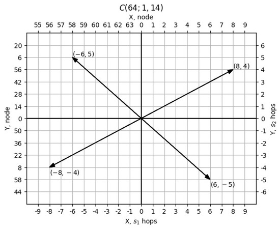 Before formulating the basic routing rules for a circulant, it is necessary to describe the procedure for determining the coordinates for its nodes. Virtual coordinate systems are widespread in communication networks, especially in wireless networks [6,41,42]. In the case of the NoC with a circulant topology, everything is simpler since the circulant graph has many symmetry groups, and all vertices in it are equivalent, which greatly simplifies its labeling since the coordinate system will be universal and can be tied to any node of the graph.