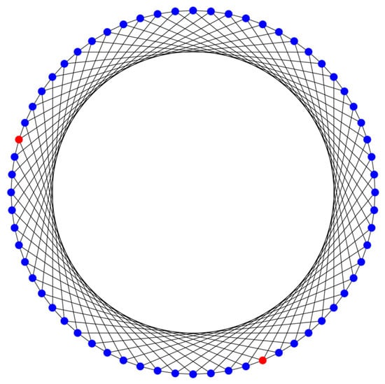 Figure 6 shows the assignment of coordinates for the circulant . Circulant nodes are defined in Cartesian coordinates. The coordinate of an arbitrary node is plotted along the -axis, and the coordinate of the given node is plotted along the -axis ( is not taken into account). Every node of the circulant will have its own position on the graph. Moreover, the optimal values of the coordinates of all nodes will fit inside the rhombus, as shown in Figure 4.