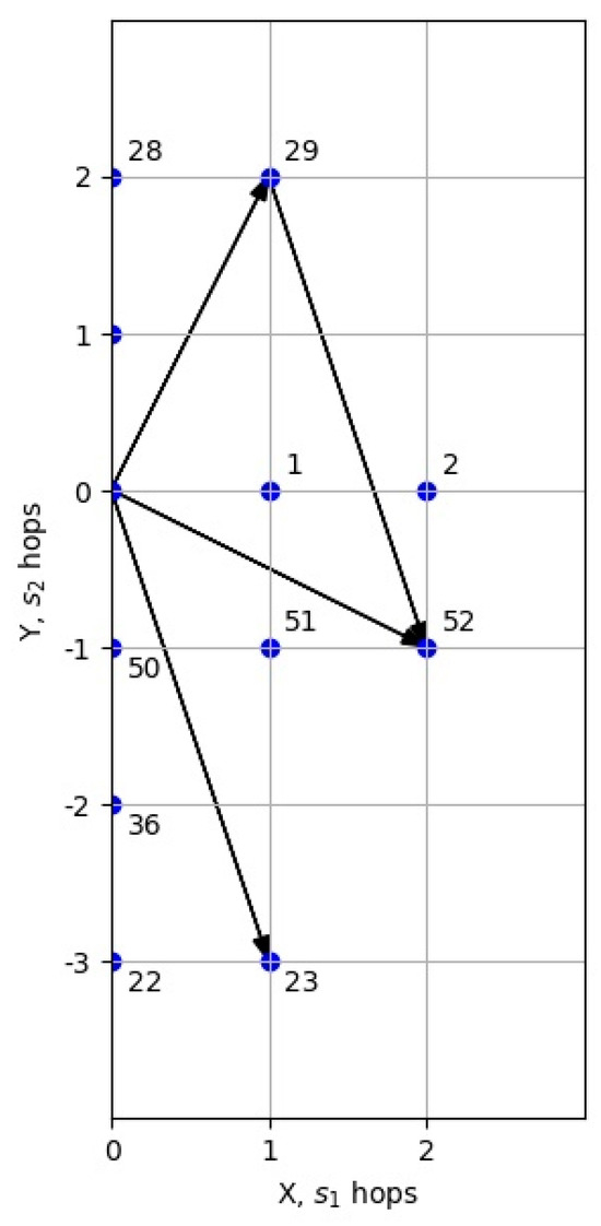 There are two ways to solve this problem. The first method is based on the fact that the circulant is invariant with respect to any of its nodes. Thus, if the absolute numbers of nodes and are restored from the coordinates, then the difference can be calculated from them. This difference can be correlated with the virtual coordinates of the node , which specify how many hops, in which direction, and along which generators must be performed to reach the destination node ( is not important for routing). The choice of which generator should be followed first by hops may depend on the routing algorithm but does not affect the length of the entire path. The problem is that in every node, it is necessary to either store a table of correspondence of absolute coordinates to virtual ones or perform the conversion procedure from virtual coordinates to absolute coordinates two times every time and then once back. In itself, the procedure for converting from absolute to virtual coordinates is essentially a method for calculating the number of hops along the corresponding generators from one node to another and has already been described in [43]. In addition, there are methods to simplify calculations, if one uses not one reference zero node but several [7,44]. Thus, the first method is reduced to classical routing methods based on the absolute coordinate system.