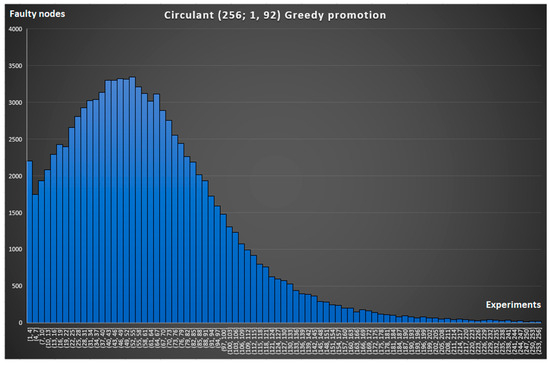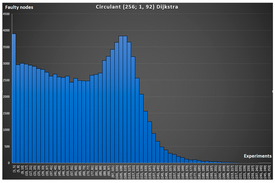 The first two graphs in Figure 10 and Figure 11 correspond to a circulant topology with ideal routing (when all possible routes calculated by the classical Dijkstra algorithm [43] are known) and with routing based on the Greedy Promotion Algorithm. The X-axis shows the number of faulty nodes until the packet reaches a dead-end and can no longer move through the network (connection break). The Y-axis displays the number of experiments with successfully built routes that fell into this interval.