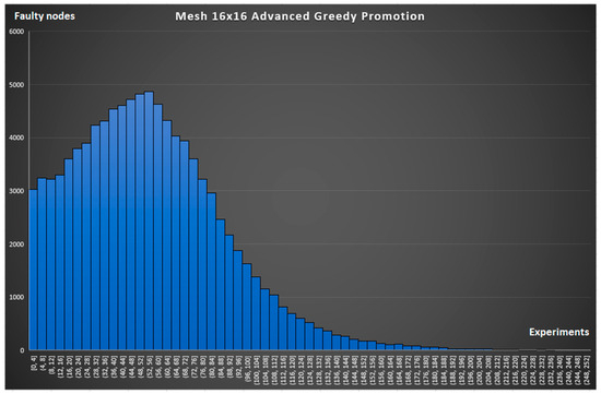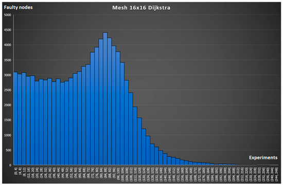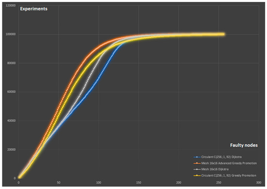 For a more objective and visual comparison, we combined the simulation results into one common graph in Figure 14. It displays the number of experiments in which a connection break occurred when the nodes, the number of which is less than or equal to the value on the X-axis, were faulty. It follows from the nature of the graph that the smaller the area under the corresponding curve, the more fault-tolerant the network. Thus, it is possible to compare different configurations of topologies and routing strategies with each other. The Greedy Promotion Algorithm is 6% worse than the ideal algorithm for mesh16x16 and 5% worse for , which is expected and is a good result since it is not possible to implement the ideal routing algorithm in NoC conditions. We can also conclude that the use of circulant topology gave 4.3% (Greedy Promotion) and 3.6% (Dijkstra) better results compared to 2D mesh.