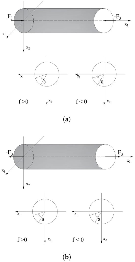 (a) Torsion of a chiral circular beam under compression; (b) Torsion of a chiral circular beam under a traction force.