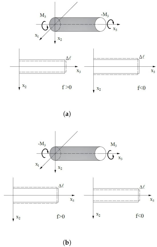 As a dual effect, the cylinder lengthens or shortens when twisted. If , the cylinder undergoes an elongation and a contraction of the cross-section. Vice versa, if , the torsion induces a shortening of the cylinder and a dilatation of the cross section, Figure 2a,b.