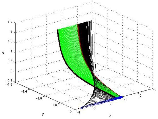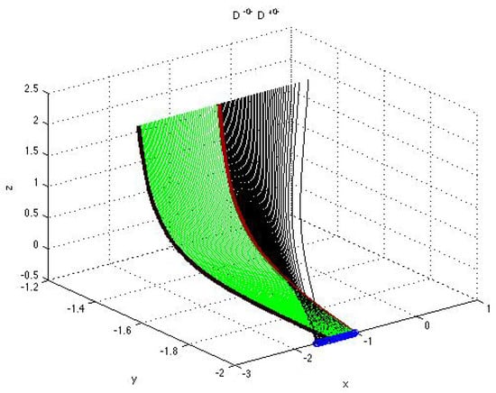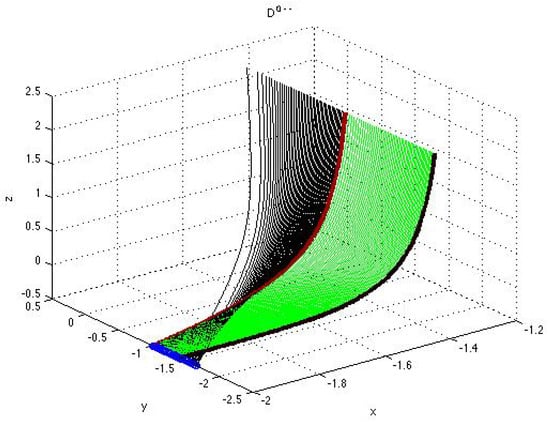 Surface formed by the parametrized curves (black), , , and (green), , with and given by (43)–(46) corresponding to the solutions from the sets D and D. The explicit formulas (A22)–(A26) for the parametrized components are in Appendix A.