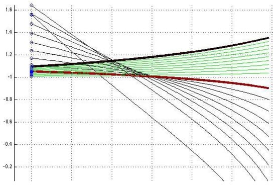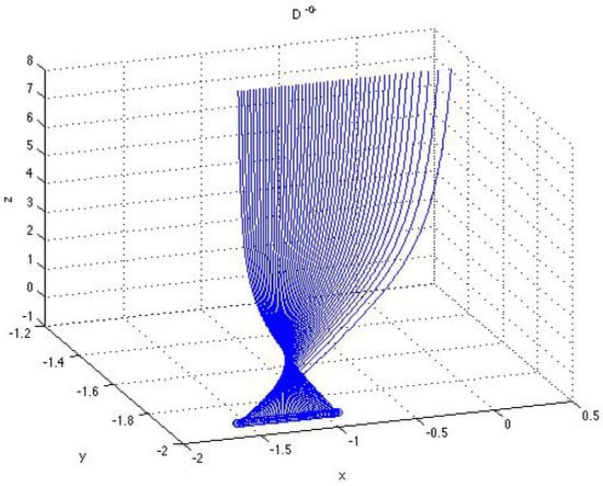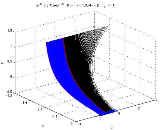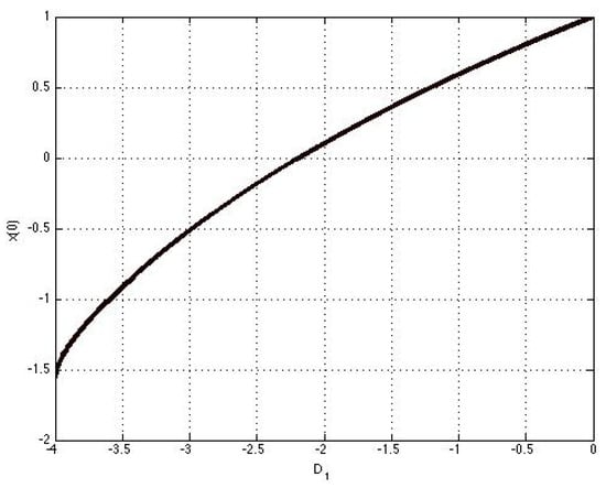 where and are, respectively, for D and D. The second component in (51) has the degenerate stationary solution , while the first and third components preserve the (positive) sign when parameter varies. Figure 11 displays the initial condition vs. of the first component of the solution (A22), (A23) from the set D presented in Figure 1. We see that the initial condition changes signs as increases, which causes a twist of the curves, contrary to the surface in Figure 2 where the solutions from the sets D and D are given by (A16)–(A21) and the initial condition for the first component considered vs. does not change signs and the solution curves in both sets D and D preserve the same shape.