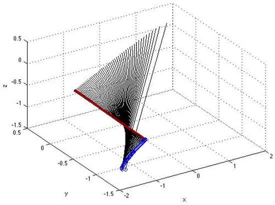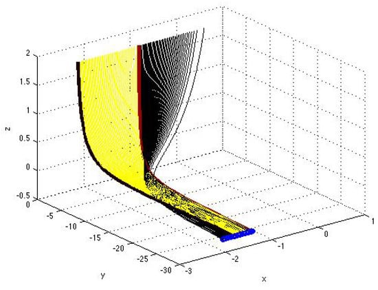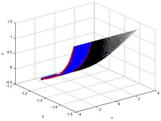 Figure 2, Figure 3, Figure 4, Figure 5, Figure 6, Figure 7 and Figure 8 illustrate the formation of a bifuraction of the type-twisted fold (a ‘cusp’). This bifuraction occurs with the variation in discriminant of a single (first or second) solution component within single family D or D at certain values of constant (namely, at ) when the first and third (or the second and third) components (independent of variable ) are bounded in a closed interval , where the parametrization is applied.